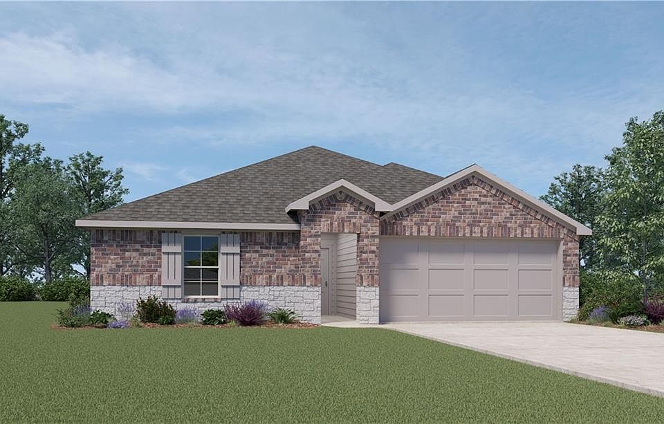 The Bellevue plan is a 3 bedroom, 2 bathroom home featuring 1,412 sq ft. The second and third bedrooms are positioned at the front of the home, each room having a large walk-in closet. The foyer leads into the spacious family room connected to the kitchen which features its own breakfast nook! The kitchen boasts a walk-in pantry, granite kitchen island, beautiful cabinets, and Whirlpool stainless steel appliances. The primary bedroom and bathroom includes a double vanity with marble top, 5’ shower with subway tile surround, and a spacious walk-in closet. Wood LVT flooring in all common areas, including living room, and carpet in bedrooms. Additional features include a rear covered patio, privacy fence, fully sodded yard, a professional landscaping package and sprinkler system at the front entrance AND a smart home technology package to include video doorbell, thermostat & exterior lighting control, and a wireless security system. Complete and move in ready! Make it yours today!