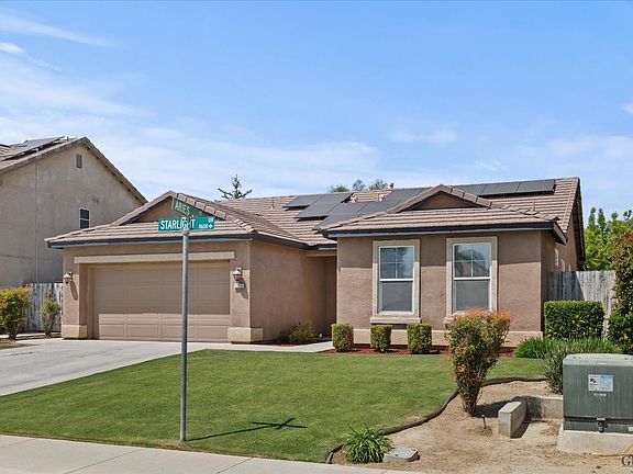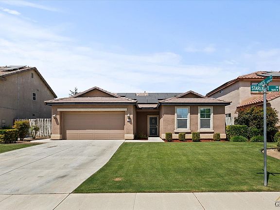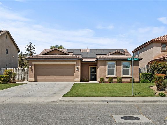 Beautiful single family home in a sought out area of Bakersfield. Excellent schools, close to shopping and parks. This 3 bedroom, 2 bath home features a split wing, 18" X 18" tile flooring, ceiling fans throughout, open concept kitchen with Oak cabinetry and breakfast island overlooking the bonus room, black appliances with gas stove, custom window coverings and shades in living room, nook and kitchen. Beautiful light fixture over dining room table, dual pane windows throughout. Large primary bedroom with en suite and walk in closet. As you step outside into the backyard there is a covered patio with concrete that extends the patio around to the RV area. The RV is also concrete which is approximately 11'x 38'. The east side of the home has a concrete walkway. The yard is well landscaped and has brick and stonework along the back fence. Cafe lighting will light up the backyard and stays with the sell of the home. The Solar System (14 panels) is owned! This property is a must see!