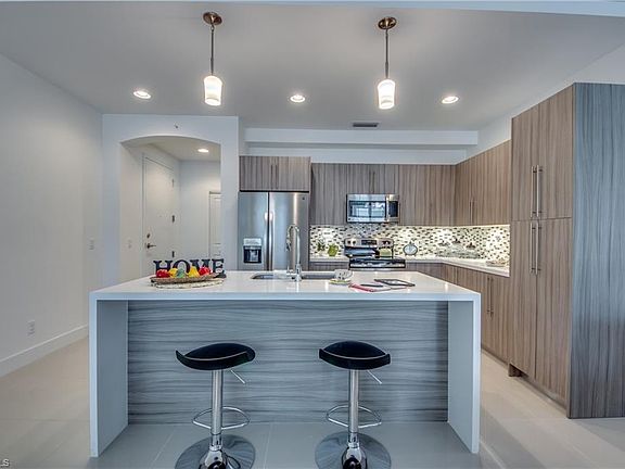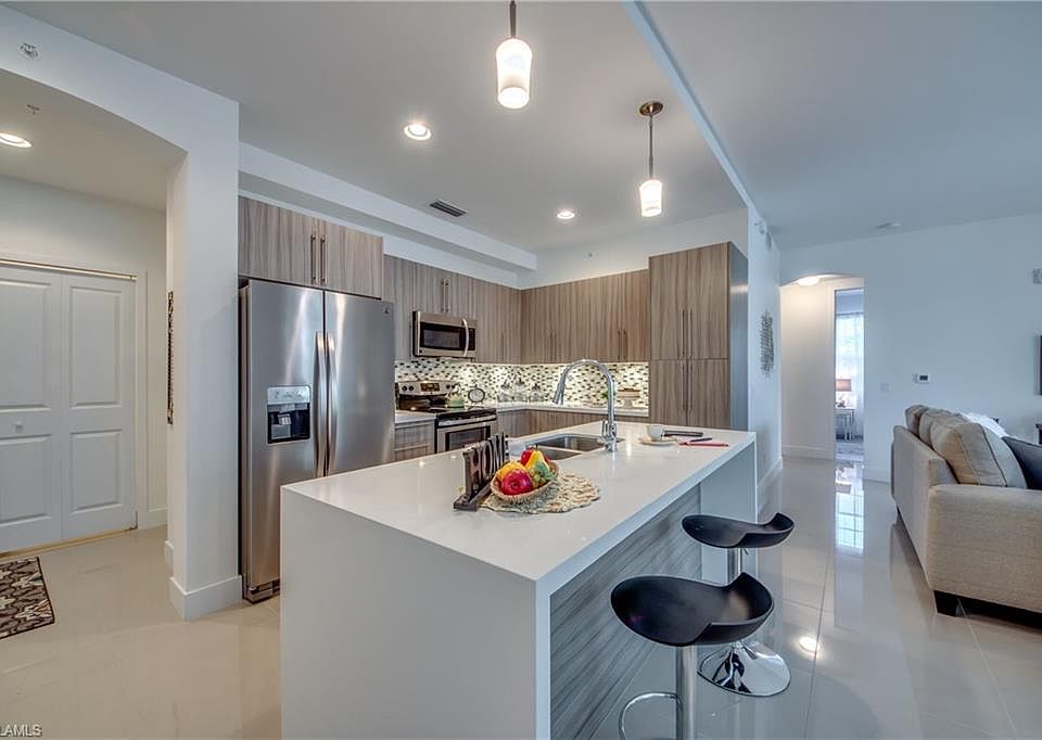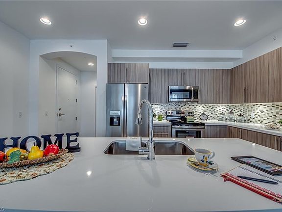 NEW LUXURY CONDOS - Move-in-Ready 3 BEDROOM / 2 Bath CORNER Unit - (Briza Floor Plan) - QUARTZ COUNTERS (waterfall style on KITCHEN island), European-style cabinetry (all soft close), STAINLESS APPLIANCE PACKAGE (Refrigerator, Range, Dishwasher, Microwave & Full size Washer/Dryer), PORCELAIN TILE, 10 ft ceilings, 8 ft doorways, Hurricane IMPACT GLASS, screened lanai, & LIGHTED covered parking. Centrally located ELEVATORS allow for EASY ACCESS to all 4 floors. Community POOL & HOT TUB with large sundeck and gas BBQ grills directly across from the building. PET FRIENDLY with approval (generous weight limits) FANTASTIC LOCATION - off McGregor Blvd & San Carlos Blvd - WALK to nearby restaurants & shopping which includes TARGET & PUBLIX. Minutes (4 miles) to NEARBY SW FL BEACHES - both Sanibel & Fort Myers Beach. 6 additional FLOOR PLANS. Pictures are from the DECORATED BRIZA model and are indicative of the finishes in all units. LOW HOA - $295/month. Be sure to take the 3D VIRTUAL TOUR! *5 DECORATED MODELS*