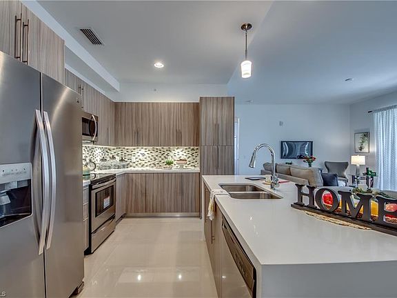 NEW LUXURY CONDOS - Move-in-Ready 3 BEDROOM / 2 Bath CORNER Unit - (Briza Floor Plan) - QUARTZ COUNTERS (waterfall style on KITCHEN island), European-style cabinetry (all soft close), STAINLESS APPLIANCE PACKAGE (Refrigerator, Range, Dishwasher, Microwave & Full size Washer/Dryer), PORCELAIN TILE, 10 ft ceilings, 8 ft doorways, Hurricane IMPACT GLASS, screened lanai, & LIGHTED covered parking. Centrally located ELEVATORS allow for EASY ACCESS to all 4 floors. Community POOL & HOT TUB with large sundeck and gas BBQ grills directly across from the building. PET FRIENDLY with approval (generous weight limits) FANTASTIC LOCATION - off McGregor Blvd & San Carlos Blvd - WALK to nearby restaurants & shopping which includes TARGET & PUBLIX. Minutes (4 miles) to NEARBY SW FL BEACHES - both Sanibel & Fort Myers Beach. 6 additional FLOOR PLANS (3 Decorated Models). Pictures are from the DECORATED BRIZA model and are indicative of the finishes in all units. LOW HOA - $295/month. Be sure to take the 3D VIRTUAL TOUR! *5 DECORATED MODELS*