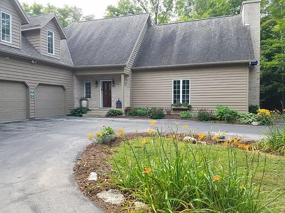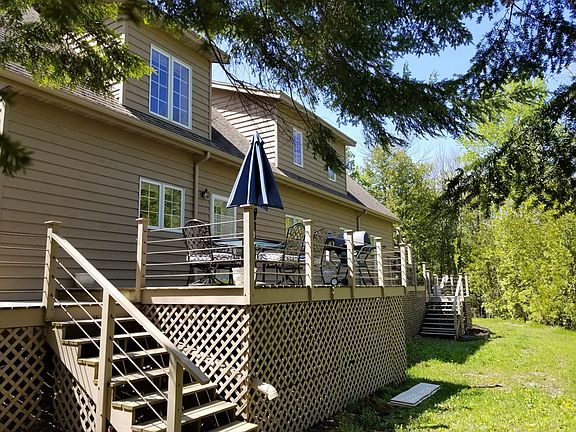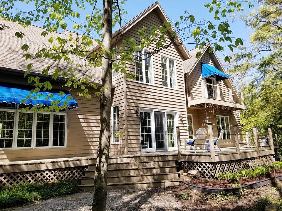 Lovely light-filled home, nestled in 20 acres of woods. The spacious living room features a tall brick fireplace, vaulted ceiling, and a library alcove. The dining room has built-in cabinetry, and cherry floors that extend into the kitchen and walk-in pantry. A four-season sunroom with doors to the wrap-around deck, a cute laundry room and a full bath round out the first floor. Upstairs is the loft, a reading nook, the master bedroom and bath, and a large guest bedroom, complete with a sleeping loft. There is also a full guest bath. Each of the bedrooms has their own balcony, where you can sip your coffee and listen to the birds sing. The basement is an unfinished walkout, and there is a two car attached garage, and a 28' x 40' pole barn.
