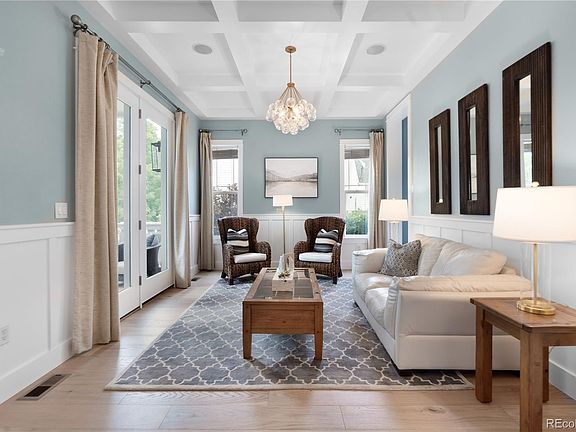 Welcome to an architect-designed masterpiece in the heart of Bradburn Village—an expansive and impeccably curated home offering nearly 5,700 square feet of refined living space, including a full carriage house with exterior entrance, radiant-heated floors, kitchen, separate stacked laundry in unit, and separate bedroom—perfect for guests or extended family. Inside the main home, newly installed wide-plank white oak floors and a chef’s kitchen feature custom cabinetry, quartzite countertops, brass hardware, and professional-grade KitchenAid appliances including dual-fuel ovens, 8-burner gas range, built-in refrigerator, range hood, and new designer lighting. Upstairs, the primary suite offers a serene retreat with a gas fireplace, sitting area with balcony, soaking tub with white-washed travertine counters, frameless shower, new cabinetry, and a boutique-style walk-in closet. Three additional bedrooms include one en-suite, one shared bath, and a versatile loft wired for surround sound. Designed for both entertaining and everyday luxury, entire house is wired for surround sound, includes an arts and crafts studio and a laundry room with dual washers, dryers, and radiant heat. The finished basement invites grand-scale entertaining with a six-seat leather theater, wet bar, game room, kids playhouse, sixth bedroom with bath, fitness area, and finished crawl space for storage. Outside, enjoy evenings under the pergola while the lawn provides room to relax and play. An oversized, extra-deep garage accommodates trucks or gear, and low-cost leased solar panels reduce utility expenses. Set in sought-after Bradburn Village, this home offers unmatched walkability to Whole Foods, restaurants, coffee shops, gyms, and boutique retail, surrounded by open space, trails, bike paths, and lakes. This is the home everyone’s been waiting for—an exceptional opportunity to own a one-of-a-kind residence in one of Colorado’s most desirable communities.