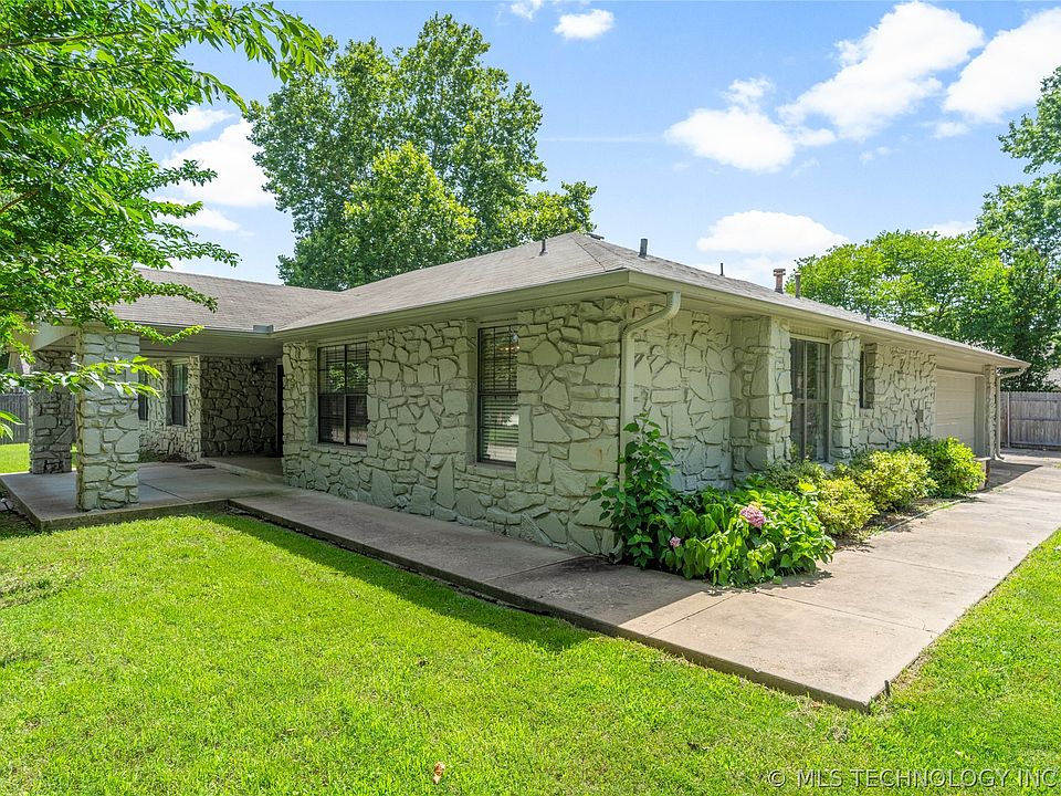Excellent Bixby location 1 owner & well maintained! This single-story corner lot offers 5 large bedrooms, 3 full baths, huge covered front w/dbl entry doors, living w/fireplace & wet bar. Master bed & guest bedroom w/attached full bath & hall bath w/dbl vanity. Updates include all new paint, carpet, laminate in living & all new doors. Utility room w/sink & sink in garage. Wide driveway for addtnl parking & NEW ROOF coming July 2022!