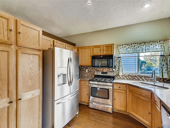 Beautifully updated and well maintained, this fabulous 3 BR, 2BA home backs to a greenbelt and is convenient to trail, parks, shopping, dining, I-25 and the new RTD N Line! Gorgeous wood floors and vaulted ceiling create a warm open feel to the spacious dining room and gourmet updated kitchen with slab granite counters, stainless appliances, newer French door refrigerator and dishwasher, 5 burner gas range, pantry and dining area with views of the greenbelt and mature trees. The warm wood floor extends into the inviting family room with gas fireplace and sliders to the fenced rear yard with a garden bed, shed and big trex style deck, and concrete patio for relaxing and enjoying BBQs. The upper level offers 2 roomy bedrooms and updated granite full bath plus a spacious master en-suite with a big walk-in closet and an updated full bath with slab granite-topped vanity. Attached 2 car garage with workshop, washer, dryer plus newer furnace & air conditioning! Buyer's home warranty with an acceptable contract for your peace of mind. This fabulous home could be yours. Call today for a tour!