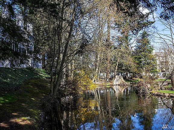 Marvelous light & spacious 1 level home with many updates. Wonderful end location, a serene setting with view of the pond. New windows, siding, exterior doors, railings,carpet & paint. Spacious LR & dining area has a fireplace & opens to the deck. Kitchen with a water view. Generous Master BR has a huge walk-in closet. Updated baths, washer & dryer area. Garage & parking space. Terrific picnic area & grounds. Close to Boeing,I-5, shopping & restaurants. No Rental Cap. Seller will pay SA. A gem!