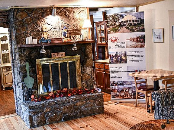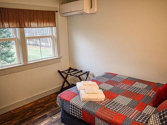 The Red White and Blue Room is a charming retreat within the historic Brook Road Inn, built in 1837. This rustic room, styled in the building's historic character, features a full-size bed for two, a closet, and a private bath. Located up a narrow staircase, the room shares a hall with eight other guest rooms. Enjoy the privacy and safety of a lockable door from both inside and outside. The room is equipped with essential amenities including heating or air conditioning depending on the season, room-darkening shades, and Wi-Fi. Guests have access to a shared area with a fridge, toaster, and microwave, as well as a coffee bar area with a water bubbler. Two spacious dining areas are available for guests to enjoy meals. Guests can enjoy free parking on the premises. Additional amenities such as outlet covers, a highchair, and a crib are available upon request. Luggage drop-off is allowed for guests with early arrival or late departure. Nestled in a picturesque setting, the Brook Road Inn offers easy access to local attractions such as Mount Sunapee for skiing and snowboarding, Gunnison Lake, and the Ruth LeClair Memorial Trail. Guests can also explore nearby Balthazar's Ice Shack, Tippicanoe Campground, and Sanctuary Farm. This is a non-smoking property, and violators will be charged a fee of $250. Guests must be at least 21 years old to make a reservation, and a state identification card or driver's license copy will be requested upon booking. The inn operates with a self-sufficient check-in and check-out process, with the front door locked 24/7 and accessible only with a code provided in your check-in instructions. Quiet hours are from 9 PM to 7 AM on weekdays and 10 PM to 9 AM on weekends. The inn is eco-friendly, providing towels and washcloths per person for three days at a time. Guests will be charged for any missing items after checkout. The garage and basement are off-limits to guests, and no pets, food in bedrooms, or intoxicated guests are allowed.