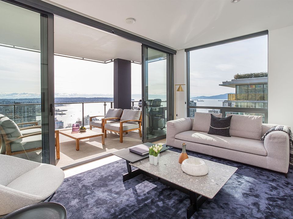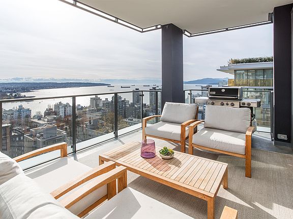 Captivating English Bay view residence at The Jervis, designed by Inform Interiors & developed by reputable Intracorp. This premium home, the highest elevation of this SW corner floor plan, enjoys an interior of 1,345 sf. featuring a large covered view terrace & boasts sensational views of the ocean, mountains & cityscape. The kitchen is appointed w/ TLK cabinets, Bianco Statuario marble backsplash, Gaggenau appliances & a walk-in pantry. The 2 full bathrooms are clad in white marble tile & appointed w/ Flaminia, Duravit & Gessi fixtures. The primary bedroom is complimented w/ closets by Kico Home Elements & a spa-like 5 pc ensuite. Concierge service & fitness room. A boutique development w/ only 58 homes, The Jervis is ideally situated in Vancouver's desirable West End neighbourhood.