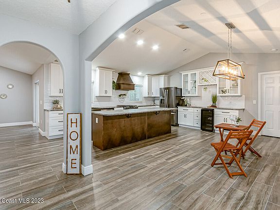 Viera living without Viera taxes. Located in Three Meadows, just one block north of Viera East. This 4 bedroom POOL home has been completely remodeled. Owners have open up the walls to create a chefs dream custom kitchen. Massive island with Leathered granite, built in wine bar with wine fridge & built in gas range. Beautiful wood tile throughout. Large dining and family areas will hold all the furniture. Inside the master suite you will find his & hers walk in closets. remodeled bath with large shower, garden tub, dual sinks & pool door. On the other side of the home you will find 3 bedrooms with guest bath and 2nd pool door. The kitchen and family room both overlook the screened free form pool. 29ft trussed porch with outdoor kitchen, granite countertops, movable island & outdoor TV!