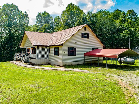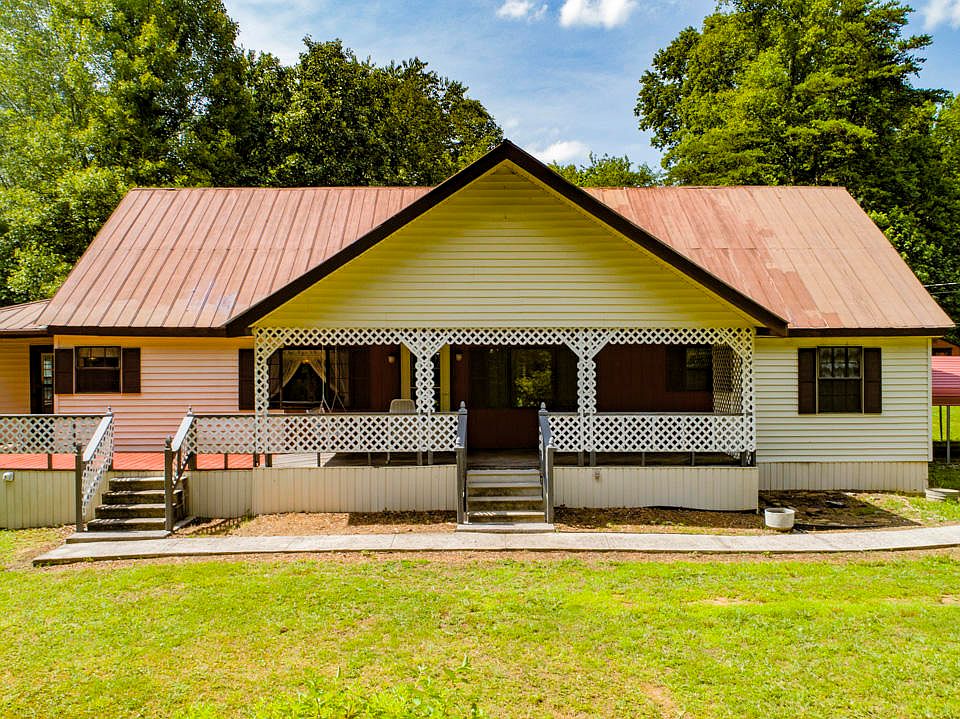 Your sanctuary awaits! Spanning a bountiful 40+ acres of trees and trails, this charming farmhouse is perfect to start living the country life you've been dreaming about! In a peaceful and quiet located set back from the road, with no restrictions, this is the opportunity you've been waiting for. This tranquil setting is ideal for livestock, horses, farming opportunities as well as to expand into a quaint B&B. Furthermore, this bucolic setting boasts stunning nature trails for riding horses or 4-wheelers, walking, wildlife/bird sightings, and so much more. Embraced by the wonders of a wooded setting, this 2-story home with metal roof shows off a tremendous partially covered front porch with picturesque lattice detailing and detached carport. (cont)