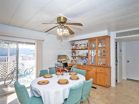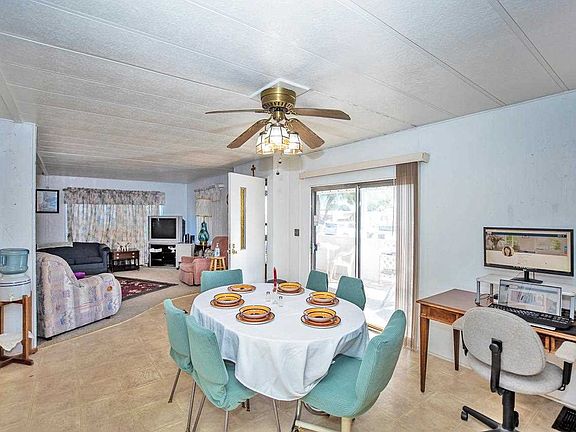 Spacious double wide at Magnolia Village. 1248 SF with 8' X 23' front covered patio and 8' X 3-' back screened patio, and metal storage shed. Plenty of on site parking. Bright and open, enter to great room with space for dining, living & kitchen with breakfast bar, white cabinets offer plenty of storage, Gas range, refrigerator, washer and dryer. Main bedroom has bathroom with soaking tub & independent shower. Built in hutch in dining area. Community pool HOA $150 per year. Age restricted neighborhood