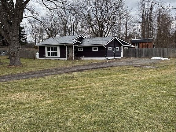 This two-bedroom, one-bath ranch offers a great opportunity for those looking for a starter home or something to downsize into. Updates galore, this property has lots of improvements including many of the big ticket items that all homeowners dread replacing. A new metal roof and gutter system, vinyl windows, furnace and central air, hot water heater, upgraded electrical service, whole house water softener system, and septic tank. Situated on just over half an acre with a fully fenced in backyard, this house has plenty of outdoor space to entertain and enjoy the outdoors. Just minutes from the thruway, this property makes getting to many of the Finger Lakes region's amenities a quick trip, all while allowing you to relax at home, free from all the hustle and bustle.