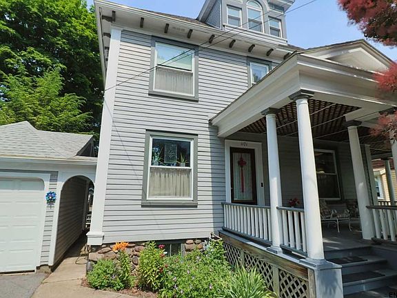 H308686 Original Van Antwerp Farm Colonial, circa 1900. Gracious home w lots of living space.Two living rooms, spacious kitchen, dining room w custom cabinetry, den/office and sunny breakfast room first floor.4 beds up.Walk-up attic ideal for more living space. Wrap around porch, attached garage, two-tiered deck and original 2bay insulated carriage house w heat and electric perfect for shop or studio.Original exterior details, painted in 2015, roof 2016. Nat/Grid budget $211/mo. Walk to schools and shops