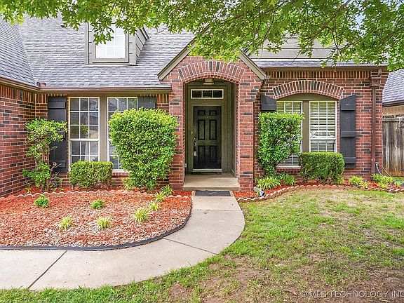 This great Jenks home offers an open and versatile floor plan with 4 bedrooms and 3 full bathrooms, an upstairs game room and a first floor theater room. As you enter the home into the two story foyer, your eyes are drawn to the view of the great backyard pool and hot tub. The family room opens to the kitchen with a large pantry and breakfast nook. A large island/bar separates the kitchen from the family room with a corner fireplace and great natural light. The first floor en suite master offers walk-in closet, double vanities and dual shower heads. Additionally, there is a second bedroom on the first floor with a full bathroom directly across the hall. There are two upstairs bedrooms with walk-in closet, a bathroom and game room. New interior paint throughout, new carpet, new driveway, new lighting, new hardware, walkout attic storage. Neighborhood pool, park, walking trails and easy highway access.