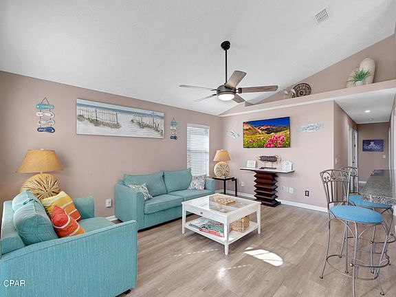 Fully furnished and established SHORT-TERM rental detached single family home in Palm Cove managed by Soleil Vacations, this 3-bedroom, 2-bathroom home has LVP flooring throughout with tile in the bathrooms, open concept kitchen & living room, large primary bedroom with private bathroom, walk-in closet and exterior door access to a private florida room. The community pools are just around the corner and the sugary sandy beach is less than 1-mile away. The subdivision of Palm Cove in Panama City Beach, Florida makes for a great vacation home, just a block from Shipwreck Island Waterpark and 2-blocks from Rock'it Lanes and several restaurants and attractions. Palm Cove offers community pools, trash service, security gates, and one of the few non-condo HOA's that provides regular power washing of your home, as well as yard and grounds maintenance. Roof, HVAC are from 2019 and Water Heater from 2014. All Information is deemed to be reliable, but is not guaranteed, buyer to verify if important.