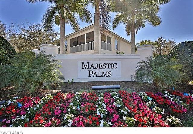 Demand "Denali" floor plan in Royal Pointe at Majestic Palms. 2 Bedrooms & Den, 2 Baths. Open floor plan features Kitchen with large breakfast bar, abundant cabinetry, lots of prep space, GE appliances, and 2 pantries. Laundry off Kitchen. Great Room with Dining and Living space. Den can easily be used as 3rd Bedroom. Spacious Master Suite and Bath feature dual sinks and huge walk in closet. Guest Suite is private...access to Guest Bath with oversized walk in closet. Light and bright throughout with cream tile floors, neutral carpets and custom blinds at all windows. Screened Lanai with southwest facing views of wooded area...sunsets are great! Beautiful community pool and spa. Majestic Palms is ideally located near beaches, great dining and shopping, medical facilities and airport. Meticulously maintained...shows beautifully...what are you waiting for?