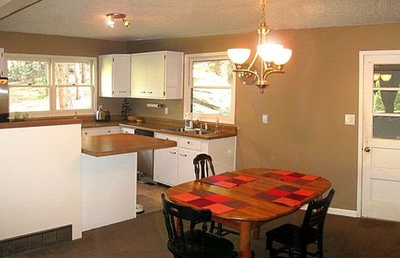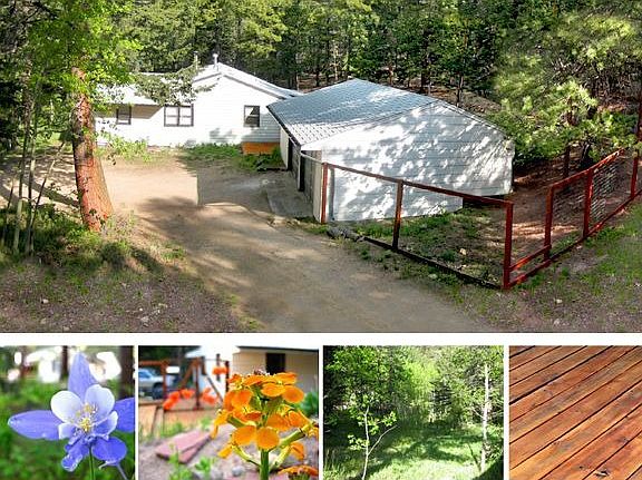 Sweet cottage in enchanted setting; majestic evergreens & aspen stands. Wildflowers! Pride of ownership shines here-covered front porch leads to open plan living, dining & kitchen. Liv Rm w/efficient woodburning stove/brick-lined niche-great way to heat the home! Kitchen w/convenient layout & breakfast bar, separate Din space. Bedrooms are big, bright & sunny w/gleaming wood flrs & large closets. Mud Room; Wonderful deck; fenced yard; greenhse; shed; oversized 2-car det-garage! Fresh ext paint.