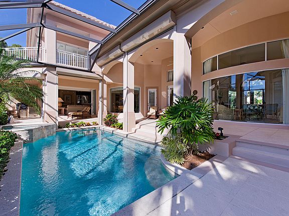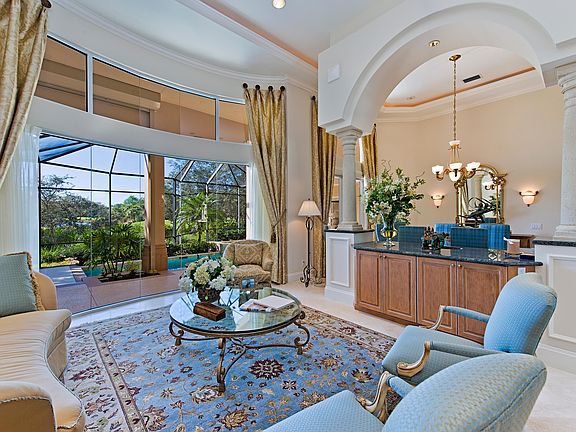 Glorious sunsets await you in this exquisite custom home situated on a south-west golf & lake view site. Designed by the Sater Group and built by London Bay Homes, spacious rooms are coupled with high ceilings and an open design to let the sunny skies and natural beauty of Collier's Reserve stream inside. The residence features a first main-level master suite with sitting area and French doors leading to the lanai and a second upstairs VIP master suite with private balcony, plus three additional bedroom suites, a large study with custom wood built-ins, and a den upstairs. A striking tongue and groove wood ceiling and gas fireplace in the family room make it the coziest place in the house, whilst the gourmet chef will most enjoy the island kitchen with gas cook top, prep sink, granite counters and walk-in pantry. Marble floors and extensive crown molding, or the many closets and storage spaces are but a few examples of the attention to detail in this residence. Golf Membership CR CLUB
