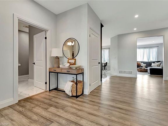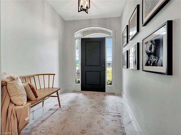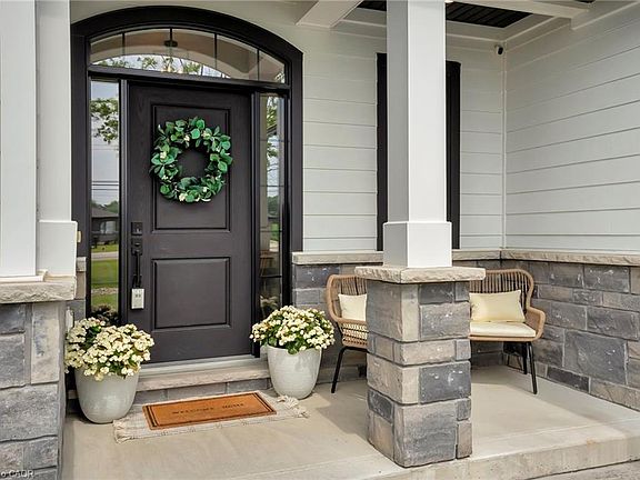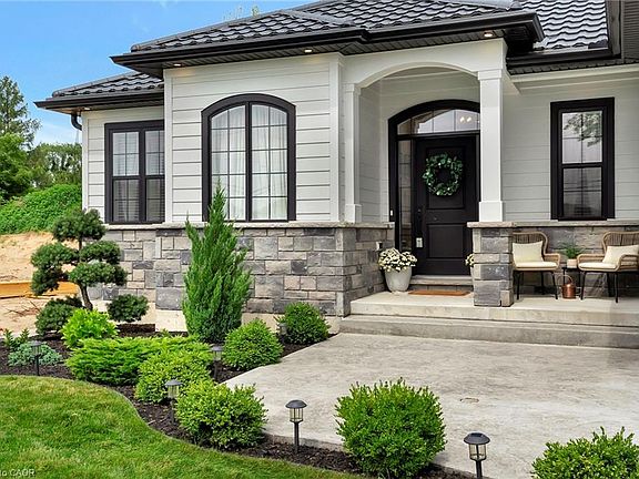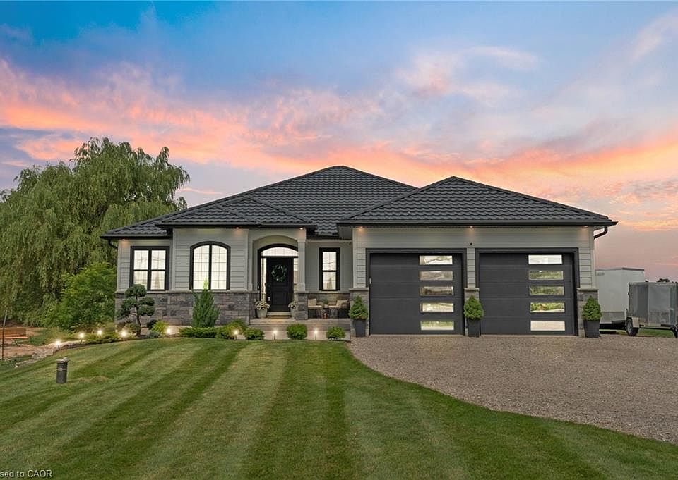 This stunning 2,141 sq. ft. bungalow is set on a picturesque lot and offers exceptional curb appeal with a double-car garage, elegant stone accents, metal roof, and sleek black trim. Beautiful landscaping and a wide concrete walkway welcome you into a thoughtfully designed home featuring soaring 9-foot ceilings and upscale finishes throughout. The gourmet kitchen is a showstopper, complete with rich dark cabinetry extending to the ceiling, striking high-contrast quartz countertops, upgraded fixtures, and tiled floors and backsplash. The oversized island is ideal for casual dining and entertaining, while the adjoining dinette offers a more formal dining space with walk-out access to the raised deck—perfect for indoor/outdoor living and enjoying scenic views. The living room invites you to unwind by the cozy stone corner gas fireplace. Additional main-floor conveniences include a stylish 2-piece powder room and a separate laundry room with custom cabinetry and quartz counters. The primary bedroom serves as a private retreat, featuring a luxurious 4-piece ensuite with a stunning glass shower and a relaxing soaker tub. Two additional bedrooms offer generous space for family, guests, or a home office, and are supported by a full 4-piece bathroom. The expansive double-car garage provides ample room for vehicles and storage, while the single-wide driveway expands to a triple-wide apron, offering abundant parking. The unfinished basement includes a finished staircase, bathroom rough-in, and deep windows—an excellent opportunity to create additional living space tailored to your needs. Ideally located close to schools, shopping, and everyday amenities, this exceptional home is also just 30 minutes from Amazon, Toyota, and Volkswagen’s Battery Plant—making it a perfect blend of modern style, functionality, and convenient commuting.