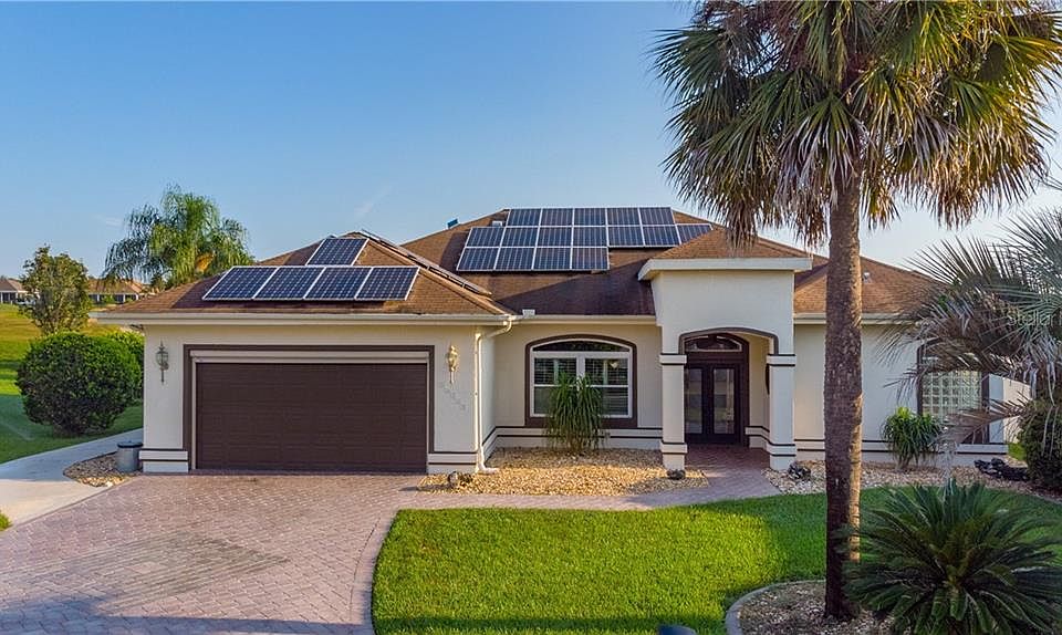 This GOLF FRONT home is priced to sell quickly! Over 2000 Sq Ft in the ENCLAVE section of STONECREST. NEW STAINLESS KITCHEN APPLIANCES AND WASHER/DRYER. SOLAR PANELS keep the electric bill to a minimum. 4 TON 16 SEER HVAC was installed in 2014. EXTERIOR WINDOWS replaced in 2016 with (DOUBLE PANE) LOW E. The Garage has an ELECTRIC PRIVACY SCREEN and KEYPAD. This home has a SOLAR FURNACE HOT WATER HEATER. There are PLANTATION SHUTTERS through out. Master Bedroom has 2 WALK IN CLOSETS. Master bath has linen closet, shower and walk in tub. The 2nd & 3rd Bedroom are on the opposite side of the house for Guest Privacy. This home has an OVERSIZED enclosed lanai with split a/c that leads to the BIRDCAGE, OUTDOOR SHOWER, SWIM SPA and 30 FT RETRACTABLE AWING. (added in 2014.) 24/7 manned guard gate, 27 holes of golf, tennis, pickle ball and more. 1 mile to The Villages and Shopping. QUICK CLOSING POSSIBLE! Room measurements are approximate, buyer to verify.