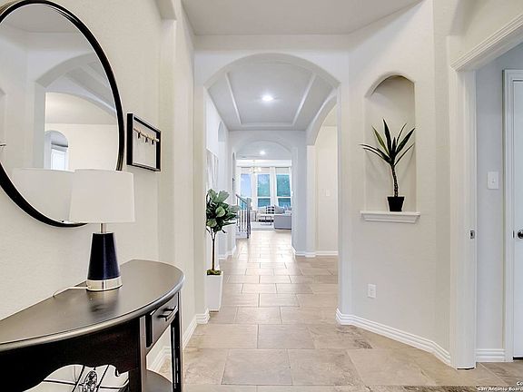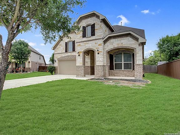Seller is offering $3,000 towards buyer's closing costs. Sensationally Stylish Two-Story Home in Schertz! Picturesquely nestled on almost quarter of an acre greenbelt lot in a highly sought-after community, this 5BR/4BA, 2,953sqft residence captivates with a beautiful stone and brick exterior, a superbly manicured flat lawn, and an inviting covered porch. Bursting with dazzling natural light, the expansive interior radiates modern panache with a towering two-story foyer, attractive tile flooring, neutral paint tones throughout, elegant arched doorways, and a stunning formal dining room. Culinary creations are a cinch in the open concept gourmet kitchen featuring stainless-steel appliances, smooth granite countertops, ample white cabinetry, a gas cooktop, a built-in microwave, a dishwasher, a French door refrigerator, a large center island, a breakfast bar, a pantry, a fashionable stone backsplash, a breakfast nook, recessed lighting, and an adjoining family room. Venture outdoors to discover a fully enclosed backyard with an 8' X 10' covered patio, vibrant greenspace, and desirable privacy fencing. Envision laughing and grilling with friends, while other guests chat and play games. After a long day of entertaining, retreat to the oversized primary bedroom, which has high tray ceilings, a walk-in closet, and an en suite. Indulge in self-care routines with a blissful garden tub, a separate shower, a linen closet, and dual storage vanities. Two upper-level bedrooms are generously sized with dedicated closets and conveniently share a Jack-and-Jill bathroom. For multigenerational versatility, one additional bedroom and a full bathroom are located on the upper-level. As a fun bonus, the enormous loft satisfies modern flex space needs. Other features: attached 2-car garage, huge laundry room with refrigerator, drop-zone with cubbies and hooks, installed gutters, irrigation system, water softener, three upper-level storage closets, near shopping, restaurants, and schools, and so much more! Call now to schedule your private showing!
