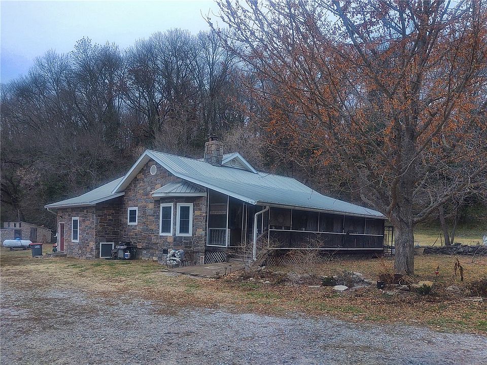 Beautiful Farmhouse, Screened in front porch, concrete stone patio, deck off the Master Bedroom. 2 living rooms, 4 bedrooms, 2 1/2 baths, laundry room mud room. unfinished basement. Lots of upgrades. 3 car garage, and Morton Shop Building, cellar, Smokehouse, Cobblestone chicken coop, Red barn, 3 concrete room building with a diesel tank, and other rooms for shelter and storage. Small barn with lean to. The six acres is owned to the middle of Spavinaw Creek. Neighbors additional 31.14 acres may be available for purchase in conjunction with this property and an acceptable offer. Sold "as is" - no repairs. AGENT OWNED.