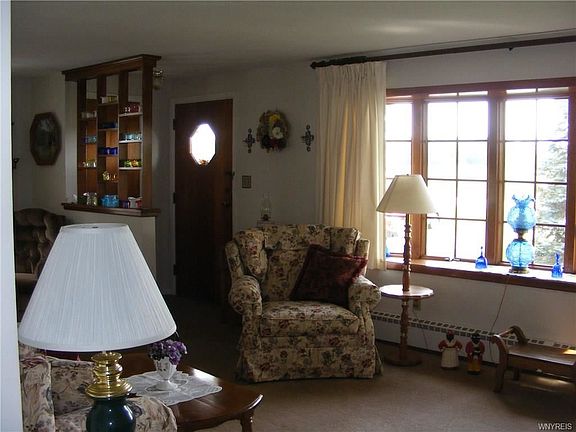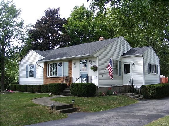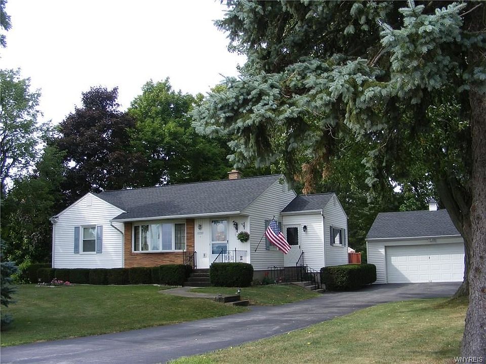 Desirable updated 3 bed ranch in Clarence schools. Living/dining combo features entry foyer closet, wall to wall carpeting, natural woodwork, and bow window. Three bedrooms, many closets, efficient eat-in kitchen w/ appliances, attic w/ pull down stairs and plank flooring for additional storage. Full basement w/ poured concrete foundation, Bilco doors. Enjoy leisure days on the deck overlooking manicured 3.5 acre yard. 2.5 car detached garage w/ opener. Some of the updates include: some windows '15-'16, roof '15, electrical service line '18. No showings until 8/22. Offers on 8/28 @6pm.