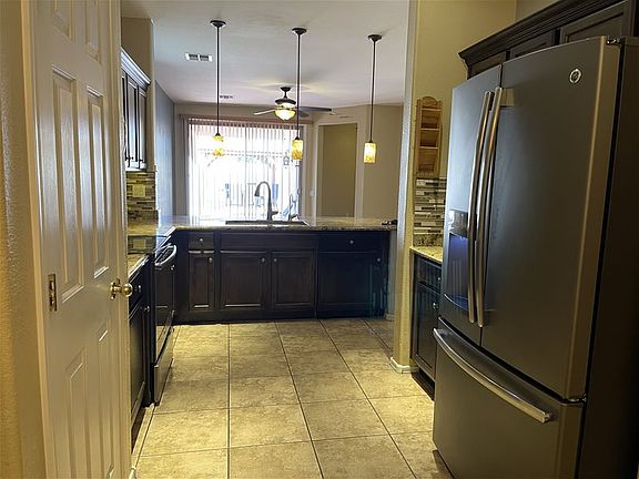 Stunning 3-bedroom home with a den located in Glenhurst, packed with upgrades! Enjoy a lovely outdoor space featuring a gazebo, tables, and chairs in the backyard. The interior boasts tile flooring throughout, a custom backsplash in the kitchen, and elegant granite countertops. Enhanced with upgraded light fixtures, two-tone paint, and beautifully stained kitchen cabinets topped with crown molding, this home is both stylish and functional. The den is conveniently situated off the family room. Dual-pane windows and a backyard with stained concrete create a serene environment. The garage features epoxy flooring and built-in cabinets for extra storage. Plus, enjoy energy efficiency with solar panels! Community amenities include a pool, clubhouse, and playground. Washer, dryer, and refrigerator are provided for convenience only. No Dishwasher** W/D/R ARE FOR CONVENIENCE ONLY* PET SCREENING, A/C PREVENTATIVE MONTHLY REQUIRED $23, & RENTER'S INSURANCE REQUIRED