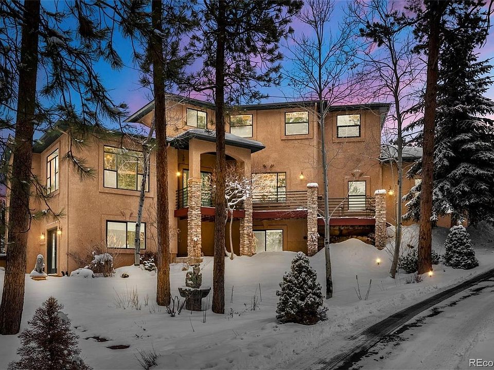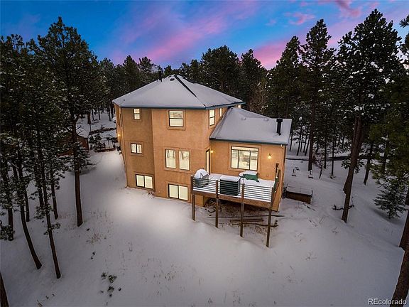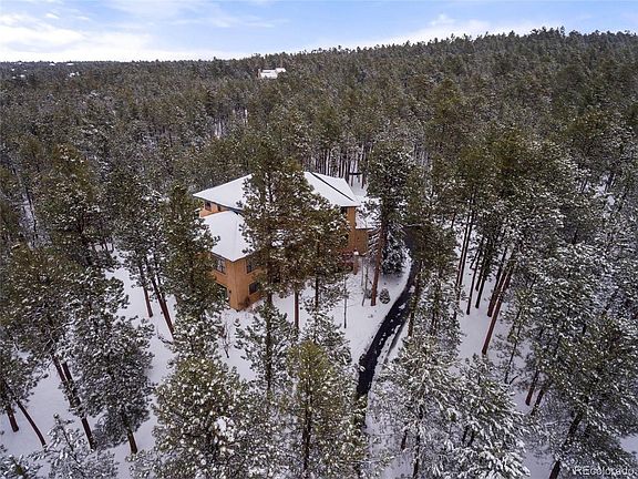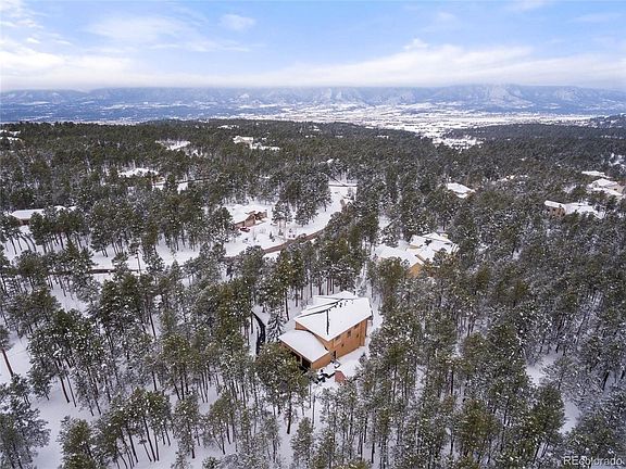 Stately custom home w/ almost 6,400 square feet perched on a knoll in a cul-de-sac w/ 2.5 treed acres in desirable Higby Estates. Beautiful Pikes Peak and mountain views. Located in a sought after part of Monument w/ quick access to I-25 or Highway 83. Close proximity to the amenities of Monument and Northgate. Award winning School District 38. Welcoming great room w/ a Colorado lodge design featuring hardwood floors, large windows for tons of natural light, a wood burning fireplace w/ stacked stone surround open to the kitchen for entertaining. Expansive kitchen w/ high end cherry cabinetry, granite counters/backsplash, stacked stone accents, recessed lighting, large pantry, eat-in kitchen nook, new double oven and dishwasher. Huge formal dining room w/ room for an eight person dining table and a large window to take in the serene surroundings of the pines. Ample outdoor living space to take in the Colorado beauty w/ multiple decks, gas grill, a flagstone patio including hot tub. Main level office w/ tons of space and built-in bookshelves complete w/ a library ladder. Luxurious master suite w/ two walk-in closets, standalone fireplace included, vaulted ceilings and a completely remodeled master bath. The 5-piece master bath has heated tile floors, stacked stone accents, alder wood double vanity w/ granite counter, standalone tub with tub filler, over-sized shower w/ two shower heads and a seamless glass surround. Finished walk-out lower level w/ a huge family room which features a walk-out to the lower level patio w/ hot tub, wet bar, gas fireplace w/ stone surround, pool table and ping pong table included. The lower level features a sauna, huge bedroom and full bath. The owners have taken great care of the home and have upgraded the following: new roof, new garage openers and doors, new well pump, smart LED lighting, deck and railings have been refinished. All paved county maintained roads to the property with an asphalt driveway. Built-in speakers throughout