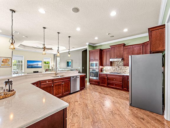 Custom built, 4 BR, Office, 3 Bath, CB, pool home smartly upgraded with energy efficient features: solar panels integrated into the flat tile roof (transferrable warranty); EV Charger in the 3-car garage with ''Smart'' GDO; Generac natural gas generator, Security Cameras, and RainSoft water treatment system with Reverse Osmosis water purification for all faucets. Chef's kitchen is well-equipped w/gleaming new quartz counters, gas cooktop & pot filler (!!); designer single-bowl sink and touchless Moen faucet; upgraded cabinetry with pull out drawers, spice cabinet, & appliance garage; and a large WI pantry. Enjoy a welcoming retreat in the Owner's suite overlooking the pool, with spa-like bath with 2 sinks, quartz counters, large shower, garden tub, & two WI closets. All main living areas access the stunning pool & outdoor space and are beautifully presented with designer laminate plank flooring laid on the diagonal, crown moulding and professionally installed surround sound speakers, and mounting bracket that will convey with the sale. The split floorplan offers three additional bedrooms plus two full bathrooms in a separate wing of the home. The outdoor space is perfect for entertaining with the heated, saltwater pool, trussed porch with speakers, and plumbed for an outdoor kitchen, screened lanai, and raised planter beds for vegetables and herbs. This home is completely storm ready with roll down hurricane screens on the lanai (no need to move the patio furniture), accordion or roll-down shutters for side windows & doorways, and metal shutters for 3 front windows, plus continuous power from the whole house natural gas generator. This home has been meticulously maintained with new/newer HWH; AC Coils, Air Handler & Air Purifier; Dishwasher, Refrigerator, Solar Transducer, GDO, pool heater and chlorinator - see full list of recent upgrades in Documents tab.