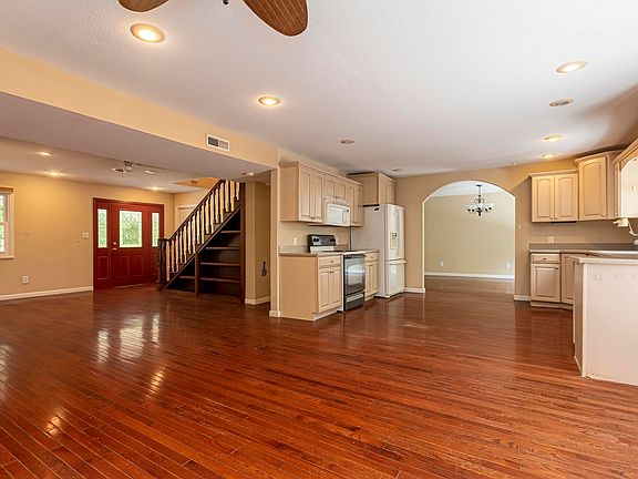 LARGE HOME! IN COUNTRY SETTING! If you are looking for space, this is your home! Situated on 1.5 acres of land this home features main floor living room with fireplace, formal dining, solid surface counters and plenty of cabinet space in the kitchen, bedroom and bath. Upper floor sports 3 very spacious bedrooms with 2 full baths, (primary bath has jet tub) walk in closets and hardwood flooring throughout the home. Basement could be a whole separate home in itself with a full kitchen, living area with fireplace, bedroom, utility room, recreation room and bath with shower. Outside you will find a spacious deck overlooking wooded area, covered front porch with the rocking chair and attached double garage.