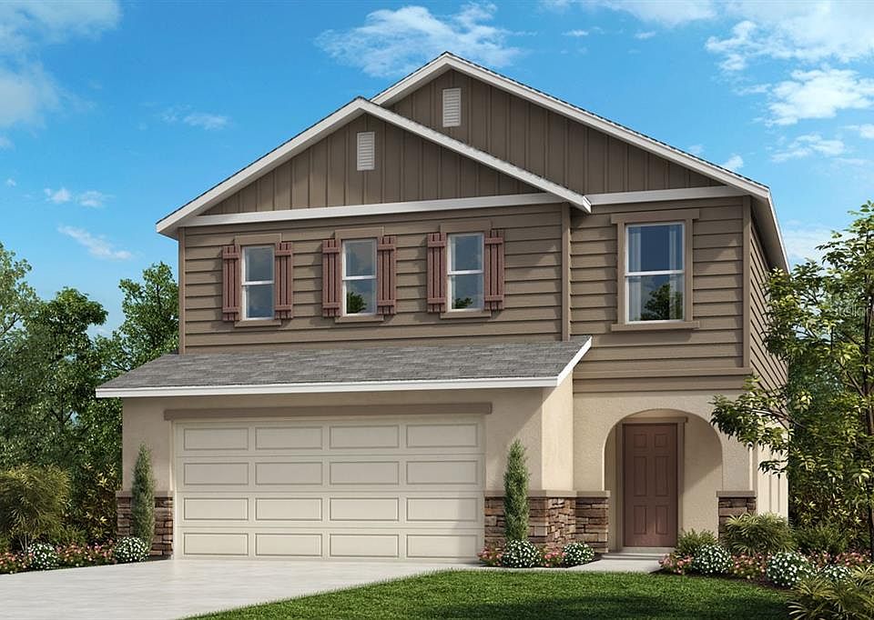 This two-story home offers distinctive features such as 9-ft. first floor ceilings, stone exterior, & upgraded tile flooring in cream. On the first floor, you’ll discover an open kitchen overlooking an inviting great room, a powder room, a large pantry, and a dedicated laundry room with direct access to the garage. The kitchen showcases 36-in. upper cabinets, a peninsula, a chrome Moen® faucet, a stainless-steel Kohler® sink, and stainless-steel Whirlpool® appliances. Upstairs, there are two secondary bedrooms with walk-in closets, a spacious loft, and a full bath with an extended cabinet. Across the hall, the primary bedroom boasts a connecting bath with a large walk-in closet and an extended dual-sink vanity.