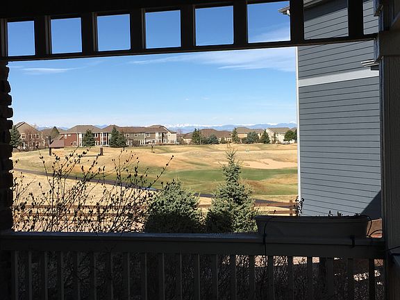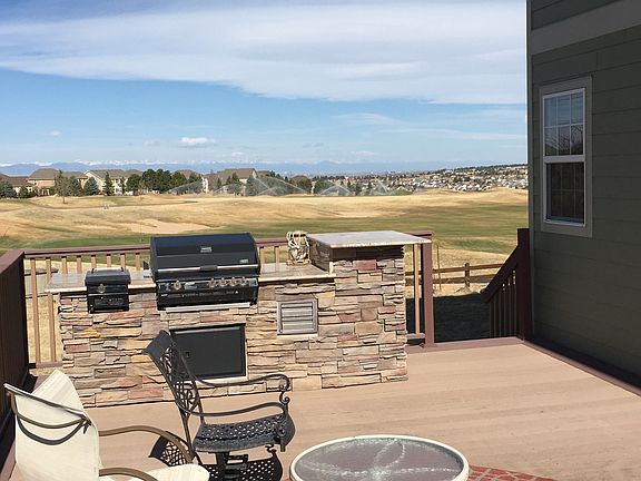 Savor snow-capped mountains and views of Denver from this serene home located at the end of a quiet cul-de-sac, adjacent to Black Bear golf course. Spoil friends and family with outdoor gatherings on the large TREX deck, with LED lighting accents and a striking stone/granite grilling work space, equipped with a gas grill, outdoor wok burner and storage. Later star-gaze while relaxing at the nearby fire pit, while enjoying the built-in seating and indoor/outdoor speakers. The spacious front porch (12x9) is shaded and allows for ample cozy seating, so to take in the westerly view and breezes. The entryway displays beautiful hardwood floors and a nearby study with double French doors. The granite kitchen, with beautiful maple cabinetry, boasts black appliances and corner sink, a gas cooktop, double-oven, instant hot faucet and an island for bar stools. The bright and airy open floor plan accommodates a carpeted family room with gas fireplace, as well as living and dining rooms. Further enjoyment of the westerly views can be shared from the privacy of your large master bedroom, with a 5-piece bath with granite countertop and walk-in closet. Three additional guest bedrooms are located upstairs, in addition to the guest bath and a spacious laundry room, both with granite countertops. A spacious 5th bedroom has been tastefully finished, which has ample closet space and occupies the full basement. The basement is wrapped with insulation and has been plumbed for a 4th bath. The 3-car garage has epoxy flooring, with lots of storage and a work bench. The back yard has a shed for all your gardening tools, located adjacent to an fenced elevated garden.