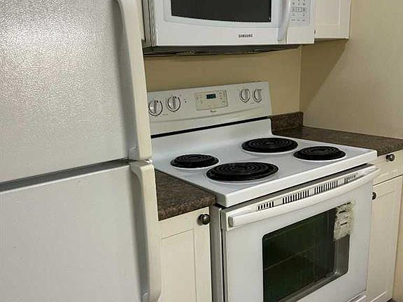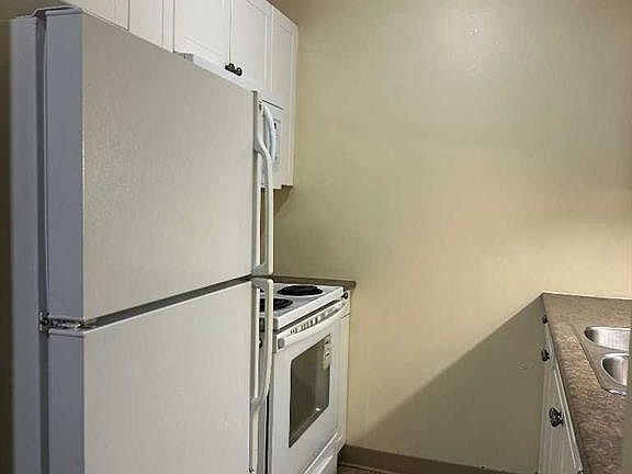 Bright and functional kitchenPlenty of newer cabinetsDurable countertopsClassic white appliancesLarge windowsNatural lightSpacious bedroom