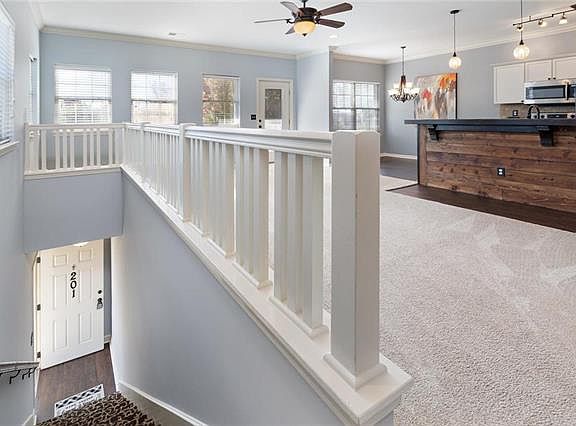 Turn-Key Lifestyle Living boasting Clubhouse, Fitness CTR & Pool. Covered Front Porch leads to decorative Wood Grained Vinyl in Foyer & Scrolled Carpeted Steps up to your Liv RM. Liv RM showcases a Rustic Reclaimed Barn WD Wall w/Built-In Shelves, Honed WD BKFST Bar w/Pendant & Accent LTG. Just outside you'll enjoy the sunset on your Covered Balcony. BKFST Area adjoining Kit features Wood Grained Vinyl. Kitchen enhanced by SS Appl-STAY & Quartz CTR. MST STE-French DRS open to Den/Non-Conforming BR. (TV Stays!) &