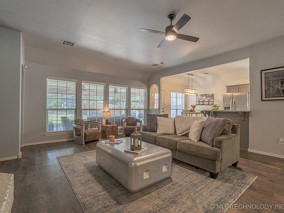 This is the one! 4 bedrooms, 2 bathrooms on main level with an upstairs game room. This home has one of the largest backyards in the neighborhood. Whether you're looking for space for a pool, a playset, or a garden, this one can fit it all. New privacy fence, mature trees, and an extended covered patio make it the perfect space for relaxing. Kitchen has updated cabinets, granite countertops, updated flooring, a breakfast bar, and breakfast nook. Gorgeous Pottery Barn lighting throughout add to the modern farmhouse feel. Split floor plan offers extra privacy for primary bedroom and ensuite bathroom. Brand new carpet in all bedrooms! Walk-in closets, walk out attic, and 2-car garage offer plenty of storage. Neighborhood pool, park, and walking trails. Jenks Schools with easy highway access. Make it yours! Agent related to Seller.