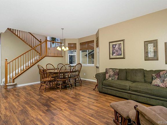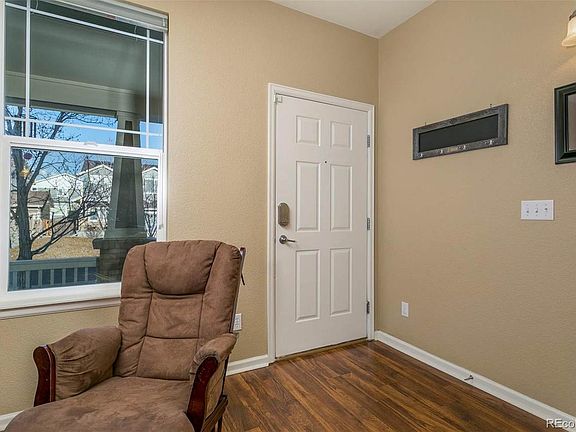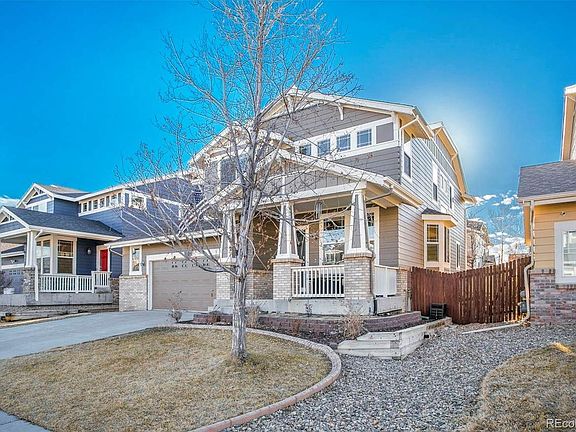 Beautiful, spacious move in ready home in a golf course community. Plant your new garden box, and enjoy the summer evenings on your large front porch. The designer curb edging around the yard leads you into your beautiful 6 bedroom, 4 bath, plus loft home. Walk into an open floor plan, including a spacious family room and formal dining room. Follow the newer hardwood laminate flooring into the gourmet kitchen equipped with black stainless steel appliances, slide out drawers in cabinets, and a double oven. Relax in comfort in the living room with a gas fireplace, newer upgraded carpet, and lots of natural light. The main floor guest bedroom is perfect for an overnight visitor. The 2nd floor includes a large master suite with a 5-piece master bath and large walk-in closet. Enjoy the huge loft area as a 2nd living space or playroom. Don't lug that laundry to the first floor; you'll find your 2nd floor includes a laundry room with utility sink and cabinets. Two additional bedrooms and a Jack and Jill bathroom complete the 2nd floor. The grand finished basement includes two large conforming bedrooms, a full bath and ample unfinished storage area for all that holiday decor. Walk outside to your low maintenance artificial turf backyard, with a beautiful awning covering the custom Trex deck. The Trex deck extends into a stamped concrete patio. The stamped concrete continues as a sidewalk to the front yard. The sellers are leaving the amazing Rainbow playset. Don't forget about the 2.5 attached garage and the custom Gemstone Lighting on the exterior of the home. You will never have to hang Holiday lights again. The home is equipped with solar panels, which have been paid for by the sellers. A home extended warranty can be transferred to the new homeowners or will be canceled by the sellers upon closing. Easy access to I-76, E-470 and the airport.
