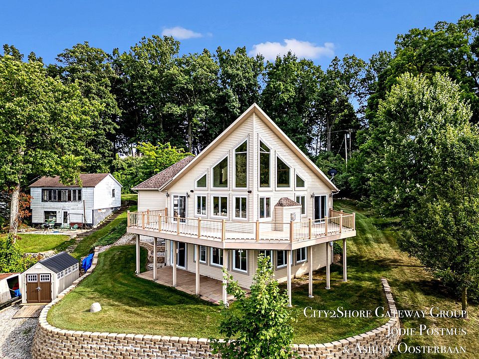 This isn't just a house—it's where memories are made and lake days never end. Nestled on all-sports Wabasis Lake, this 3,085 sq. ft. custom prow-front home features stunning water views, vaulted ceilings, and floor-to-ceiling windows that bring the outdoors in. With 4 bedrooms, 3.5 baths, and a loft overlooking the lake, there's space for everyone. The open layout and walkout lower level with kitchenette are perfect for entertaining. Comfort meets convenience with upgraded sound-proof windows, whole-house generator, and a heated snow-melt driveway system. Enjoy terraced landscaping, a private dock with lighthouse, two storage sheds (one with power), and a wraparound composite deck with outdoor speakers and tempered glass railings. The attached half-lot offers space for a guest cottage or pole barn (with township approval). Just minutes from Grand Rapids, with a public beach and boat launch nearby. Summer boating or winter ice fishing—this home captures lake life year-round.
