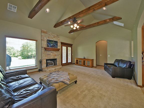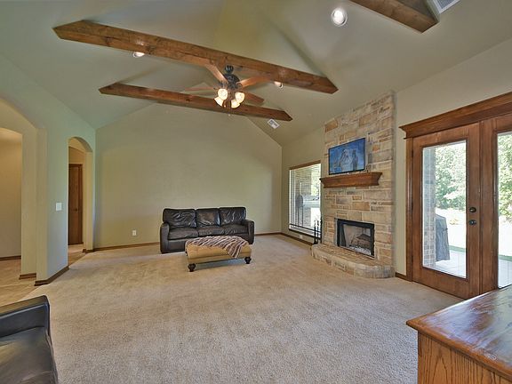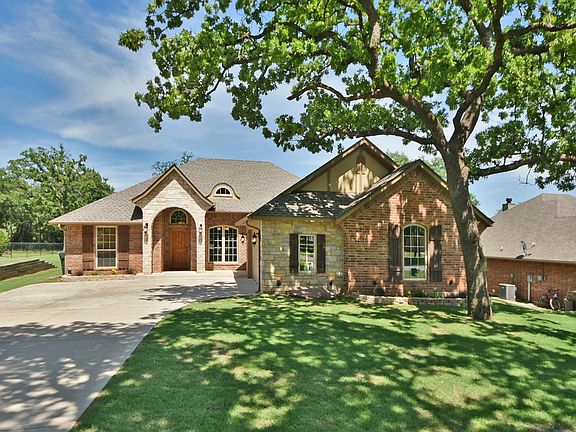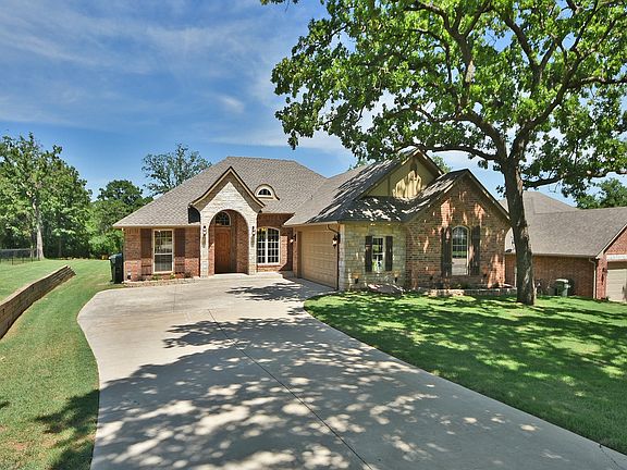Tons of extras;granite countertops,marble backsplash,island,buitin hutch,brick accents,all in kitchen.Vaulted ceiling with beams,fireplace,great view to wooded large backyard. Sideload garage,great curb appeal,covered porch and patio make this a place to call home! FOR MORE INFORMATION OR SHOWING CALL CONNIE AT 405-826-2226