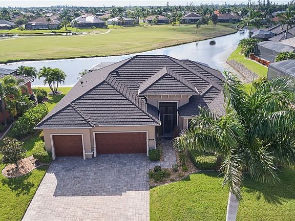 WHY WAIT TWO YEARS TO BUILD!! TURNKEY HOME!! Custom built immaculate eastern exposure 3 bedroom + 3 full baths + 3-car garage + pool home with a golf & lake view home at Cape Royal Golf & Country Club a gated Golf Community. This beautiful perfectly maintained 2631 sq-ft under air home was repainted outside in the last year. NEW POOL CAGE & NEW METAL ROOF!! Gorgeous crown molding and tray ceilings hi-light the great room. The kitchen comes with a breakfast bar, and beautiful high end granite counter tops. The main bedroom suite provides direct access to the pool area and the ensuite master baths comes with his & her sink, separate tub & walk-in shower and two walk-in closets. Guest will enjoy a lovely bedroom suite with a full bathroom and direct access to outside lanai and pool area, while the other bedroom provides versatility for guests or a home office. Step outside, where a heated pool and spa beckons you to unwind either under the sun or moon. Relax on the spacious screened lanai, complete with a covered sitting area perfect for sipping morning coffee or evening wine while taking in the serene golf course and lake views. Motorized screening capsulates covered outside area from rain and wind. All windows and doors hurricane rated. Air Conditioner system less than one year old. Custom residence has been updated with lush landscaping surrounding this one-of-a-kind home. You don't have to do anything to this home, simply move into this financially strong gated Cape Royal golf community without all the fees. This quality custom built home has been meticulously maintained by seller. Fall in love with this home and gated golf community. Give us a call and schedule your private showing. Enjoy the virtual tour!