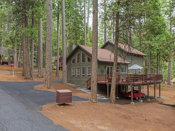 Charming Chalet in Prime Blue Lake Springs Location Walk to Fly-In Lake! Don't miss this stunning 3-bedroom, 3-bath mountain chalet nestled on a level, sun-drenched corner lot in the heart of Blue Lake Springs. Immaculate and move-in ready, this beautifully upgraded home combines classic cabin charm with modern comfort. Step inside to an expansive open-concept great room with soaring ceilings, a cozy fireplace, and seamless indoor-outdoor flow to a massive 600 sq ft deck perfect for entertaining or relaxing under the pines and stars. The recently updated interior features new flooring throughout, upgraded countertops, and fresh exterior paint, creating a warm and inviting atmosphere. The main level includes two spacious bedrooms and two full bathrooms, while the oversized upstairs loft offers a third sleeping area, private full bath, and large walk-in closet ideal for guests or a flexible living space. Additional highlights include: Central gas heat & A/C, Tankless water heater, Low-E windows, circular driveway with plenty of paved parking, weatherproof carport, and a large sub-area for storage. High-quality construction and finishes throughout. Best of all, this home is being sold fully furnished and equipped, so you can start enjoying mountain life immediately. Located just a short walk from Fly-In Lake and close to all the amenities of the Blue Lake Springs HOA including a pool, lake, tennis courts, and more! Whether you're looking for a full-time residence, vacation getaway, or income property, this turnkey chalet is a rare gem in one of Arnold's most desirable neighborhoods. Surrounding photos of the area are also included.