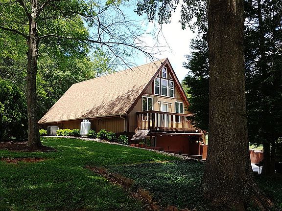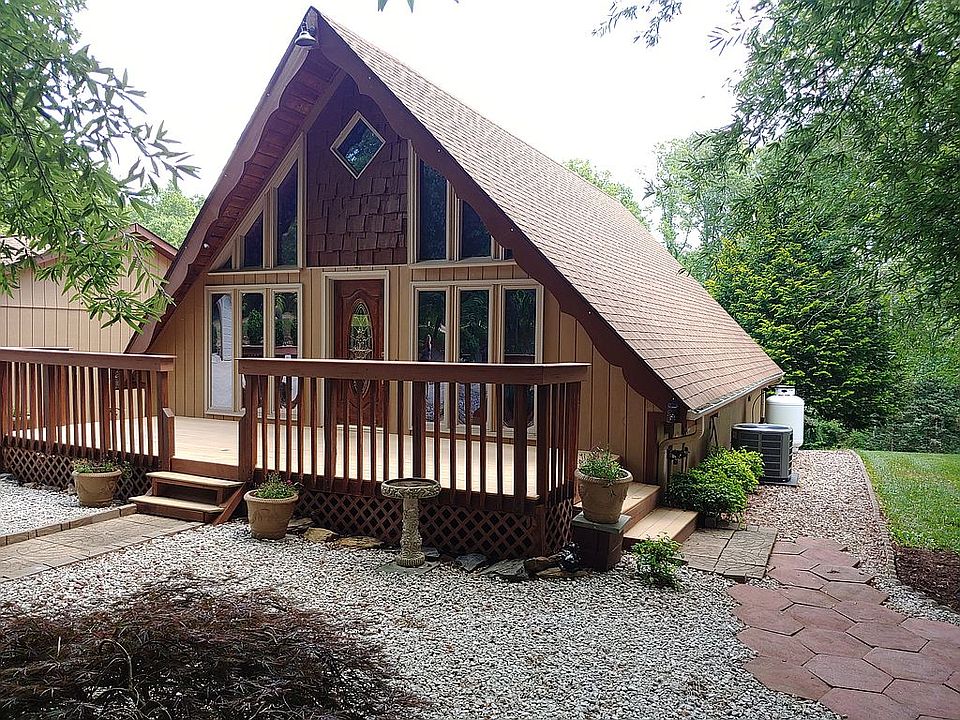 Mountain retreat living 3 miles out of King. Mostly secluded A-frame located in a small quite neighbor located in Stokes County. 3 bedroom, 2 full baths. Sitting on around 1.75 wooded acres counting the lot in front that goes with the sale. 2 year old roof, gutters and heat pump. City water and the septic tank was flushed this spring. Kitchen appliance stay including the microwave. Also all curtain and blinds. House vac system. Built in bar downstairs and a sunken tub with a step down shower. Sunken den or workout area across from bar. Walk in shower located on main level as is the master bedroom. Deck off the master bed room. Both bathrooms have tall water saving toilets and kitchen height cabinet. Home owned 150 gal. propane tank and 2 set of vent less gas logs. Includes 4 camera surveillance system. The gazebo out front is wired, has lights and 2 built in Adirondack chairs. Large patio out from the bar is very private. Furniture is not included.