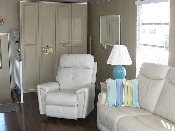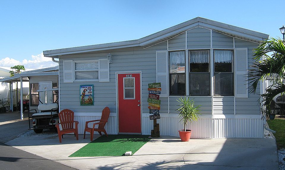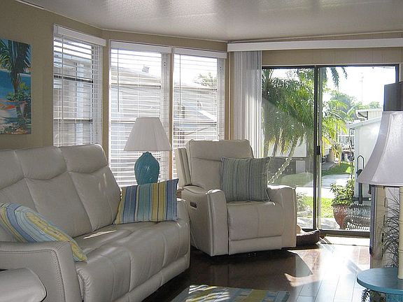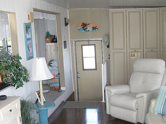 Location, Location, Location. An outstanding clean unit in Holiday Condo, where you OWN your land and have a low HOA ($145.00 per/month} which includes your water, lawn maintenance and the amenities of the park. This spacious unit is a 1 BR / 1BA with an open floor plan. It has a large kitchen with dining room seating. The large family room overlooks the patio that you access to thru a sliding door wall. The patio has a southern exposure. The unit has new flooring throughout, central A/C, lifetime roof over and the washer and dryer is included with the sale. Also included is a built in Murphy bed to accommodate overnight guests plus a fiberglass shed for additional storage outside. You will enjoy the park view across the street, no trailer directly behind you and it is located on a wide street. The gated community is close to the beaches and offers an indoor and outdoor pool, tennis courts, and planned activities. Holiday Condo is NOT a 55+ community, and pets (2) are allowed. Shown by appointment only. Taxes are non homestead. No solicitation or land contracts.