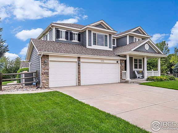 A great corner lot in Elms at Meadow Vale with gorgeous curb appeal and a welcoming front porch. This home has all the bells and whistles you need for convenient living in this desirable neighborhood. A wide open floorplan, a wall of windows with an abundance of natural light, a cozy fireplace and wood floors give this space an elegant feel. At the heart of the home, the completely updated eat-in kitchen features sleek granite countertops, stainless appliances, and a large center island. Upstairs the primary bedroom provides a peaceful escape with vaulted ceilings, a 5-piece en suite, and a spacious walk-in closet. This is a home for outdoor lovers with a large yard, a pergola-covered patio, and a gravel fire pit making this the perfect space to entertain and enjoy the Colorado sunshine. Additional features include a mud/laundry room combo, a massive finished basement with a wet bar, and a stone fireplace. plus an attached 3-car garage.