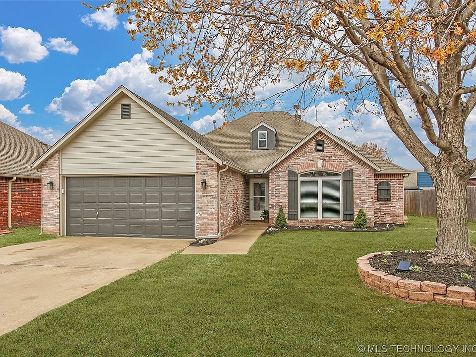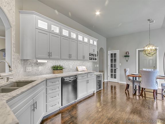 You will love this charming ONE STORY home in Churchill Park! Located in the desirable Jenks School District, this 3 bed / 2 bath home features 10 ft ceilings, arched doorways, and floods of natural light. The living room has a corner, gas-log fireplace with large windows and direct access to a covered patio. The stunning custom upgraded kitchen boasts vaulted ceilings, recessed lighting, hardwood floors, sleek appliances, wine refrigerator, built-in wine rack, quartzite countertops, gorgeous white cabinets, custom cabinet lighting, and a walk in pantry. The master bedroom has soaring 12 ft vaulted ceilings, an ensuite with dual vanities, and a whirlpool tub. This is a fantastic place to raise a family ~ neighborhood features two parks, two basketball courts, and 1.7 miles of lighted trails, as well as numerous community events throughout the year.