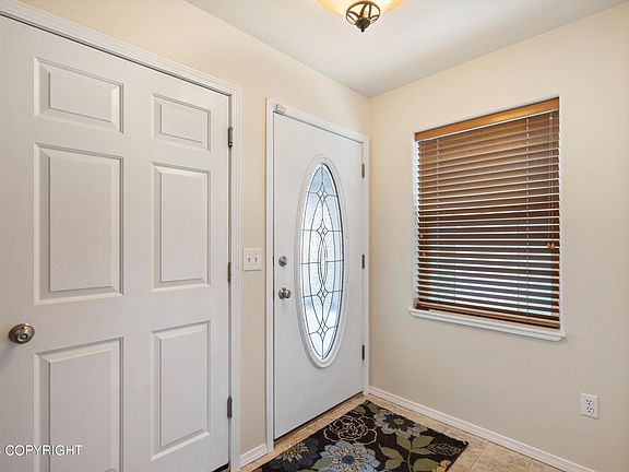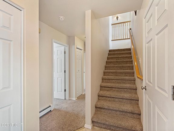 Gorgeous Townhouse Style Condo where the HOA maintains the grass & shovels your driveway! Add 2 small sections & you have a fenced yard. Open concept living w/ vaulted ceilings, a gas f/p, and fabulous natural light. Primary en-suite on main level & includes laundry. 1/2 bath off the living room. Easy to add a sliding door downstairs for yard access. Close to restaurants, shopping & JBER!