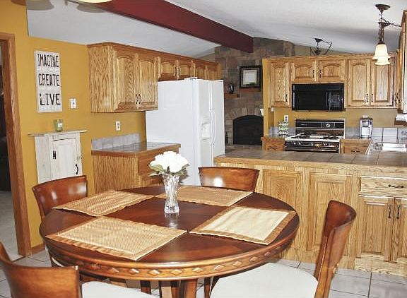 Floor to ceiling gas stone fireplace, 3 BR on 1 level, 3ba, formal/informal dining, tile floors, 6 panel doors, oversized family/amusement rm, mud rm, concrete driveway exta parking, 24x14 two tier deck, privacy wood fenced yar w/large shed.