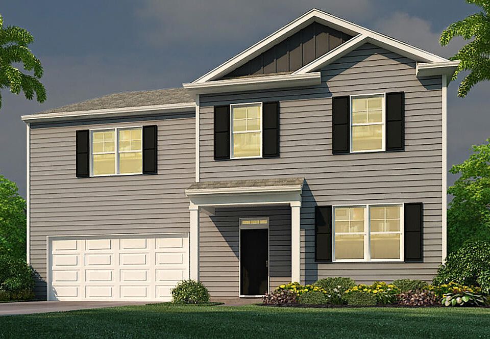 The HALTON is a two-story, two-car garage single family home. The first floor features a flex space, ideal for an office or separate dining, large open living space and kitchen, a back patio, and a guest suite. The second floor features the primary bedroom including a sitting room, two walk-in closets, and a spacious bathroom with double vanities. In addition, there are four secondary bedrooms and laundry room located on the second floor. Photos are a depiction of a similar home.