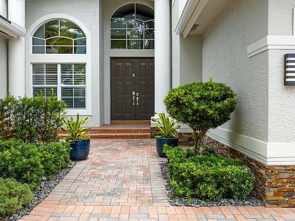 Front exterior: Professionally designed landscaping with 5 Sylvester palms. Face of house was accented with ledger stone (the only one in community) and planter was built using CBS also accented with same ledger stone.