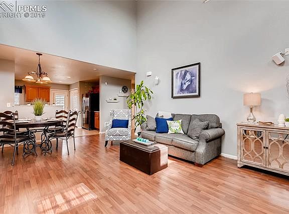 Walkout to unobstructed views of Pikes Peak and the Front Range in this charming 2 bed, 2 bath, 2 car garage home in Wildwood Ridge. Open floor plan with vaulted ceilings in living room. Plantation shutters on main level. Private master suite on second floor with small loft and built in desk. 2nd bedroom and bath on main level. Surround sound and gas fireplace in living room. Large kitchen with walkout to beautifully landscaped backyard. Concrete tile roof. Walk to neighborhood park. Convenient to I-25. School District 20.
