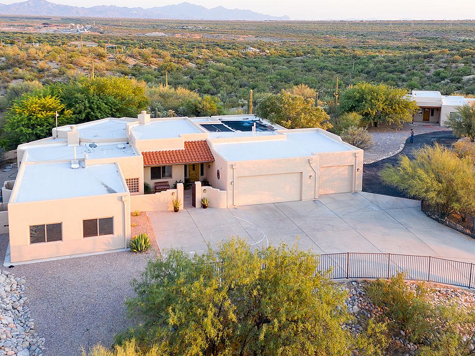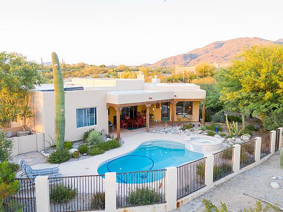 Tranquility & Endless views 3.3 AC Gated comm, sparking pool & an adorable guest house w/ mtn views too. Discover this hill top property , near Saguaro National Park East. Dining room & stunning living/music room w/double sided rock fireplace (gas) greet you from entry. Step into a beautiful kitchen w/ over-sized granite island & SS appliances-just off breakfast nook & spacious family rm w/gas fireplace. Discover over-sized master ste w/ its own private AZ room, luxury master bath & just off extensive bonus rm-perfect for home office,exercise/,game? Could add an outside entrance. 4 total BRS/offices plus the BONUS room. Private guest house offers so many possibilities for extended family, guest or studio.. Extraordinary, quiet & private setting just minutes from schools & shopping!